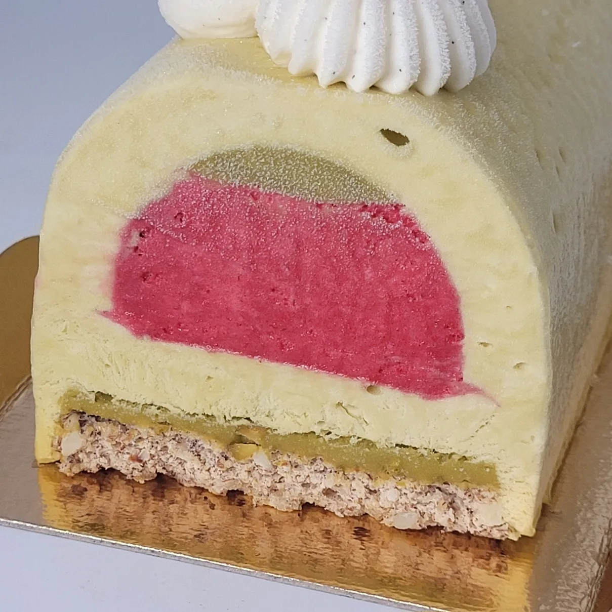Cette création associe une dacquoise moelleuse à la pistache, des mousses glacées à la pistache et à la framboise et un coulis de pistache onctueux, offrant un parfait équilibre entre douceur, fraîcheur et intensité aromatique.