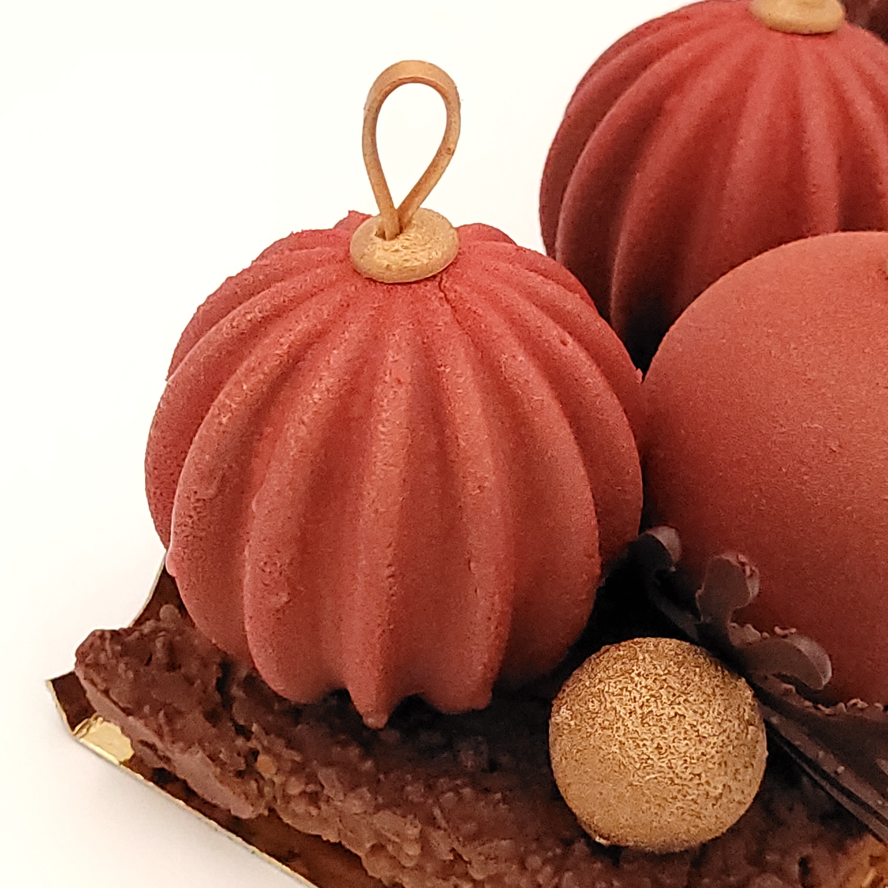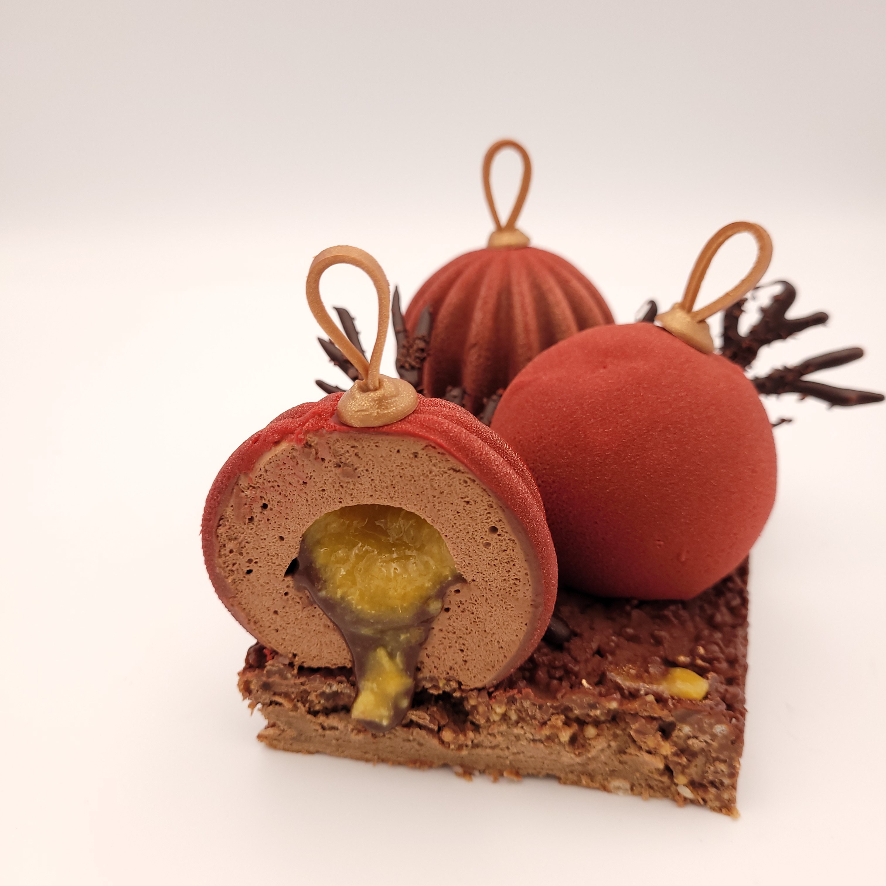Ses six boules sont composées d'une mousse au chocolat et d'un confit orange-passion dont la touche légèrement acide s'équilibre parfaitement avec le chocolat.