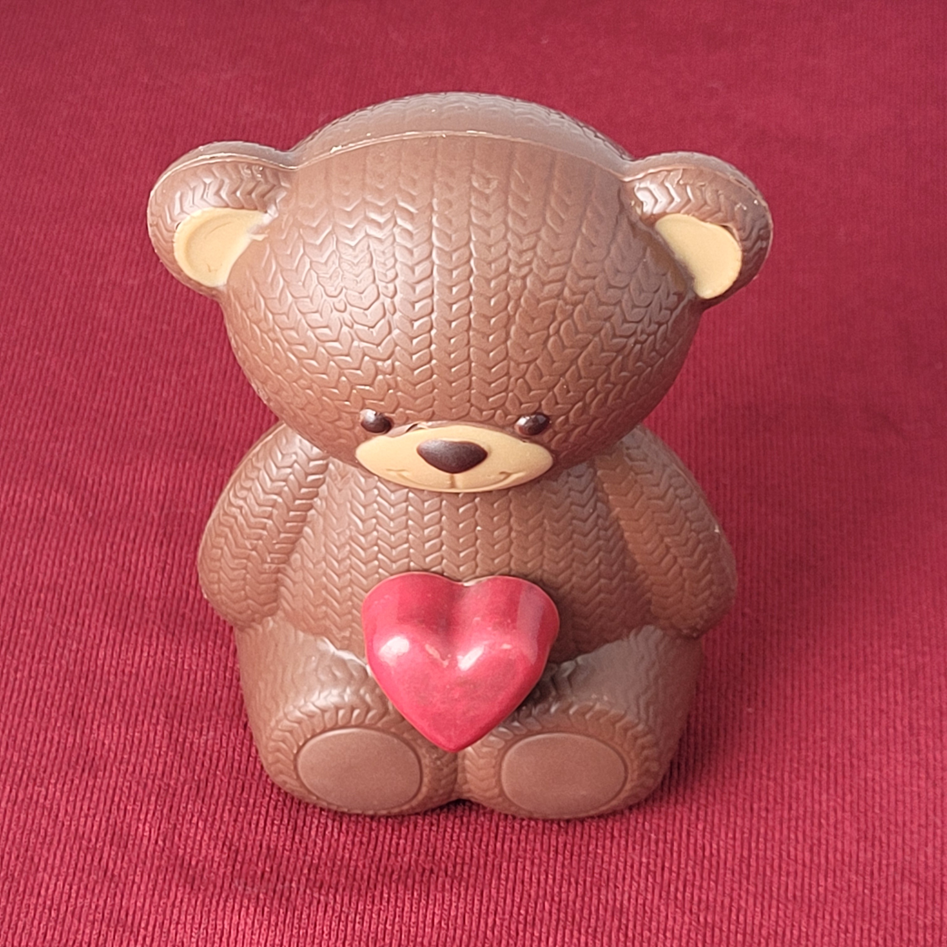 Ourson Cœur, garni de croustibilles et décoré d'un cœur praliné, en chocolat noir (71%) ou lait (41%)
