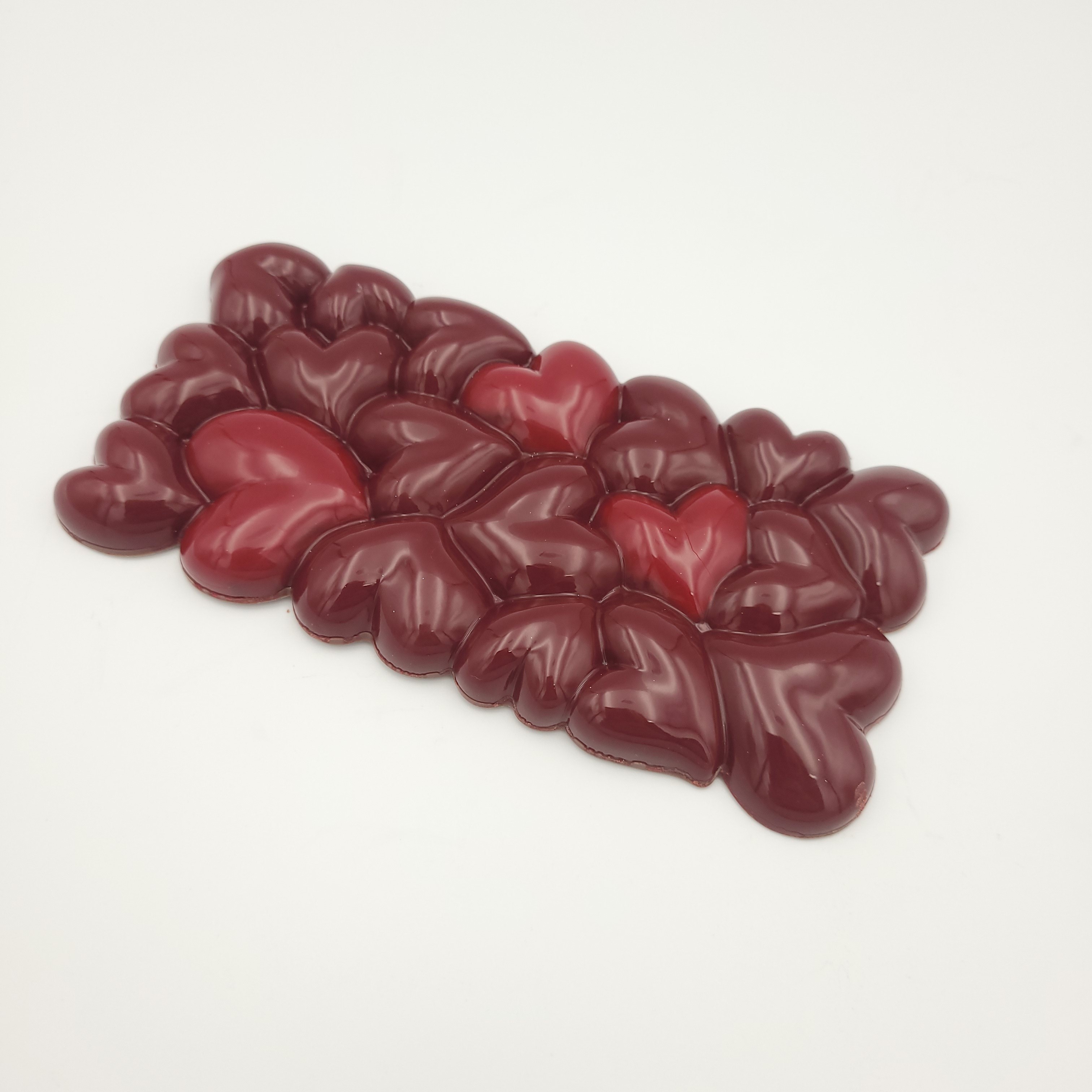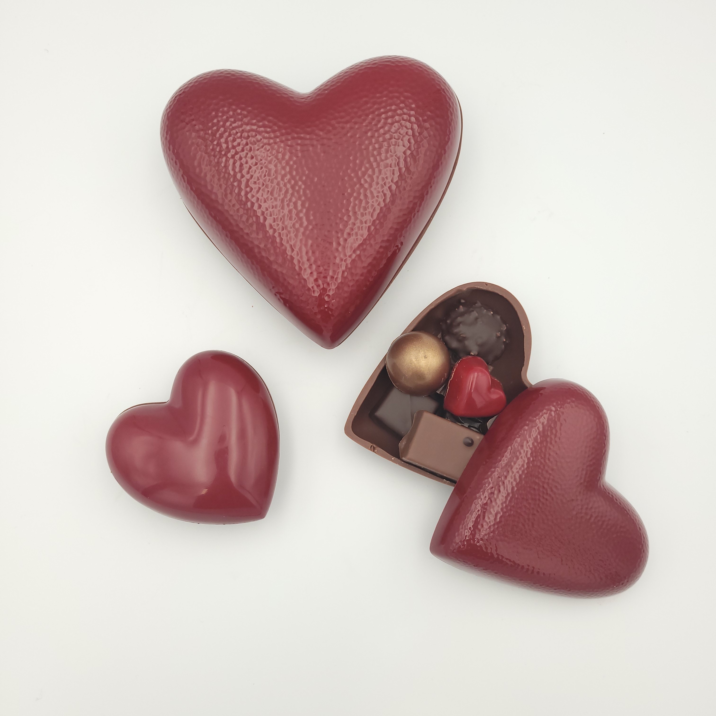 Cœur moulé en chocolat noir (71%) ou lait (41%) Garni de 4 chocolats dont un cœur rouge fourré praliné